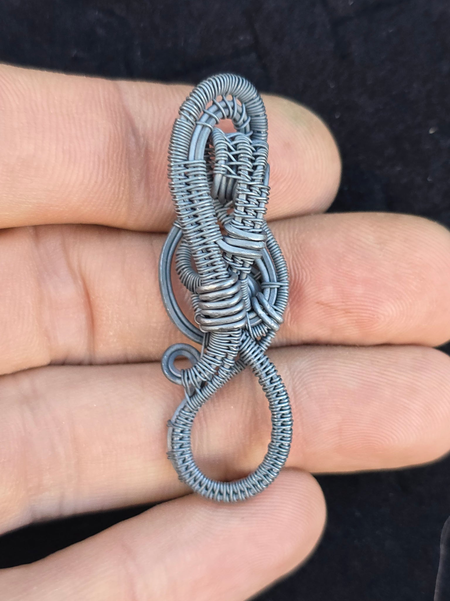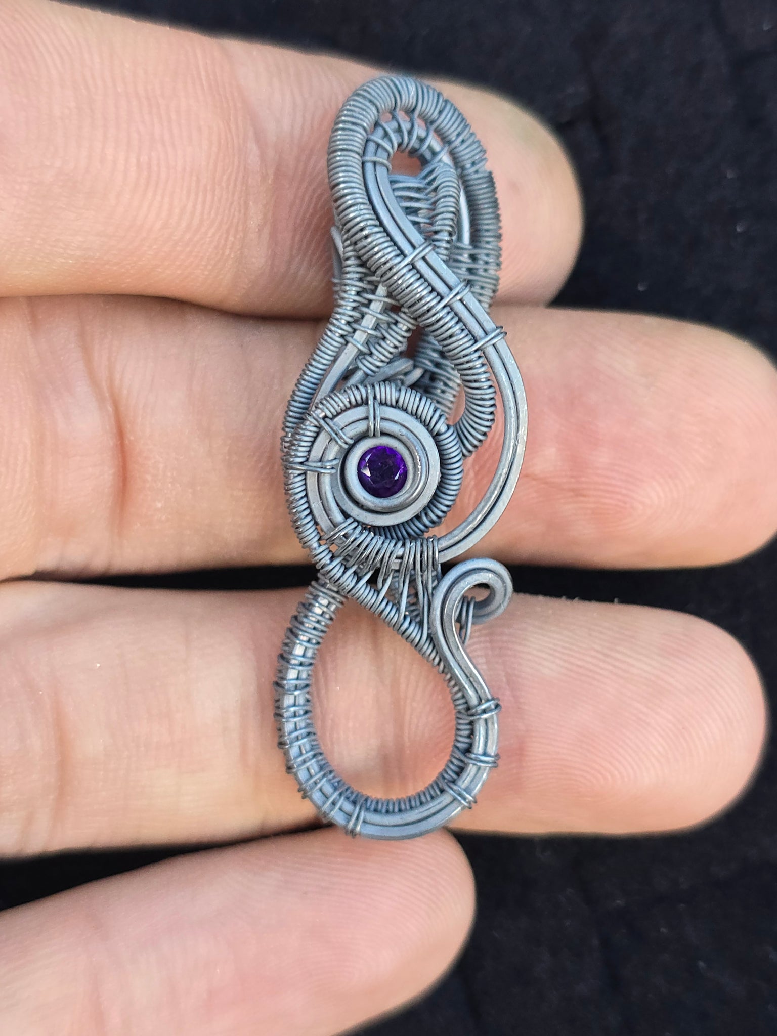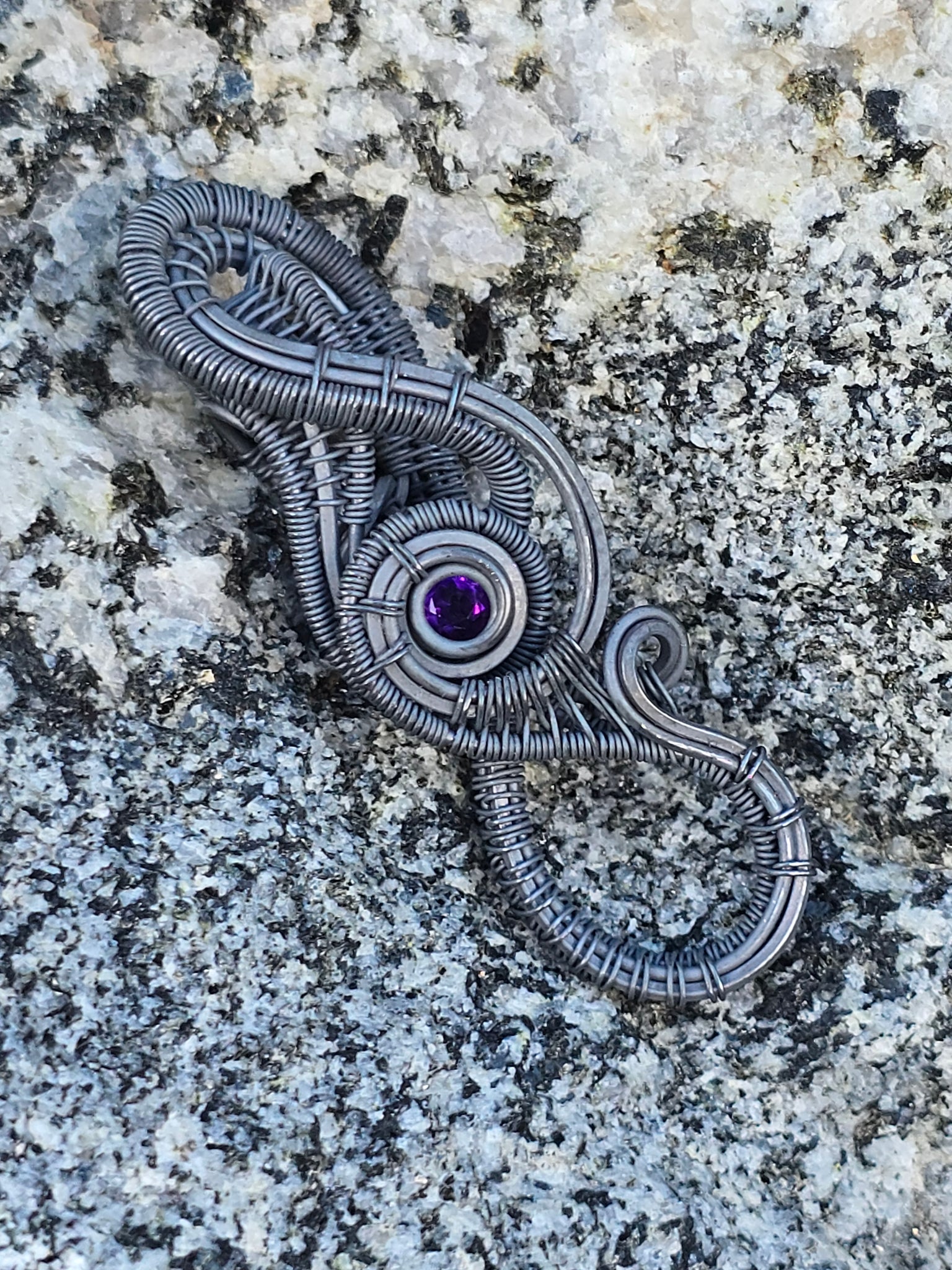 Amythest wrapped in oxidized sterling silver. 2 in. X 5/8 in.