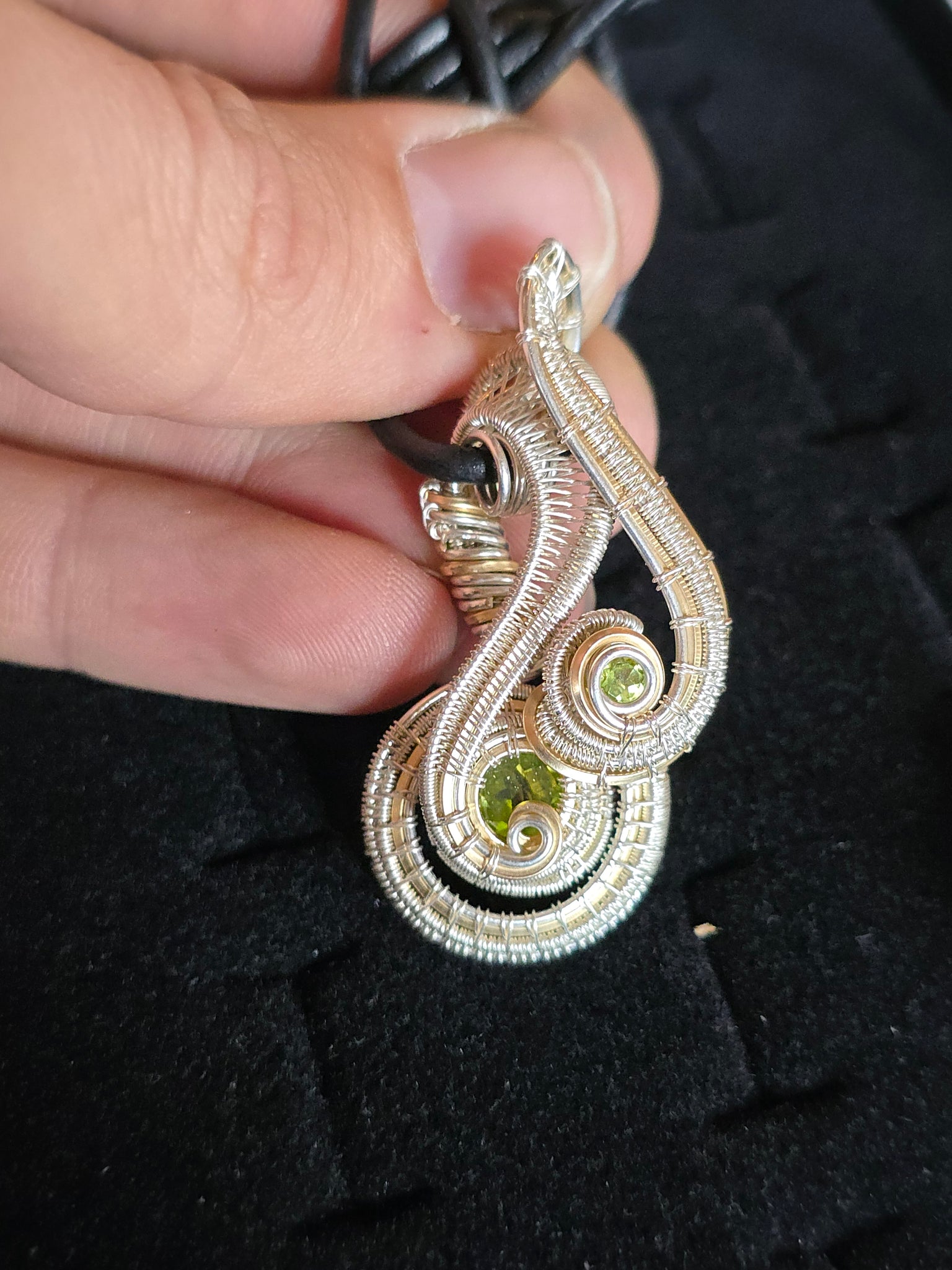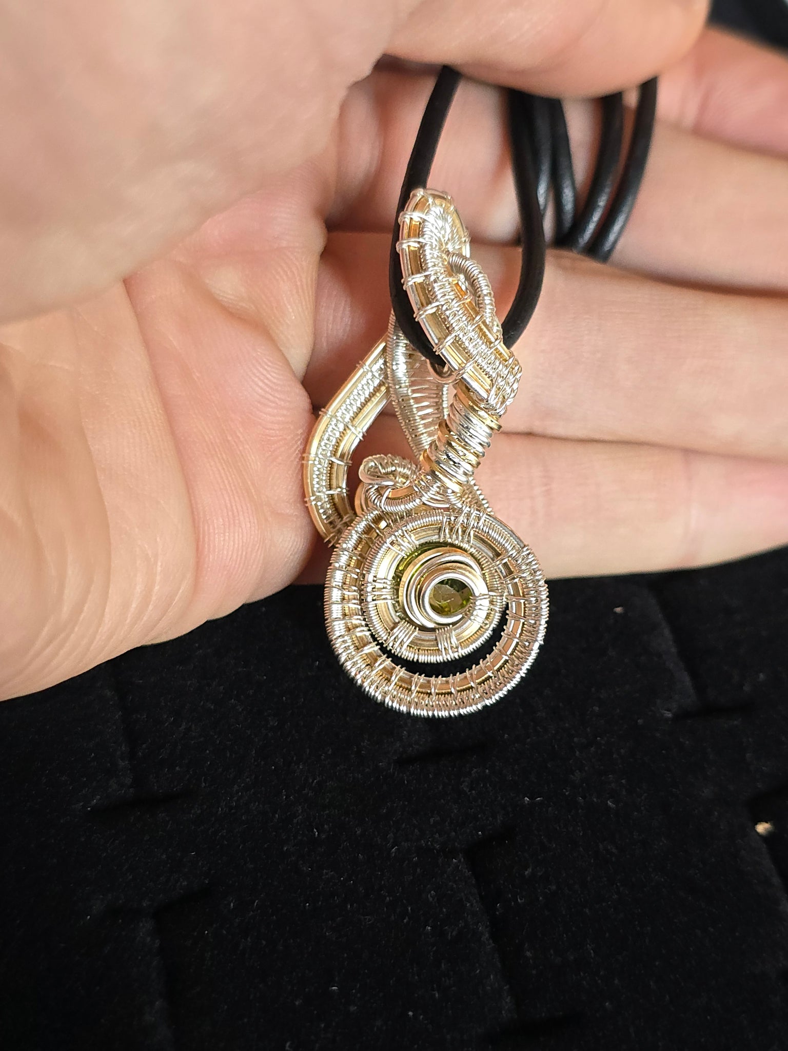 The greenest grasses only come where you water and pull the weeds. Peridot in sterling silver and 14k gold fill. 2 in x 7/8 in.