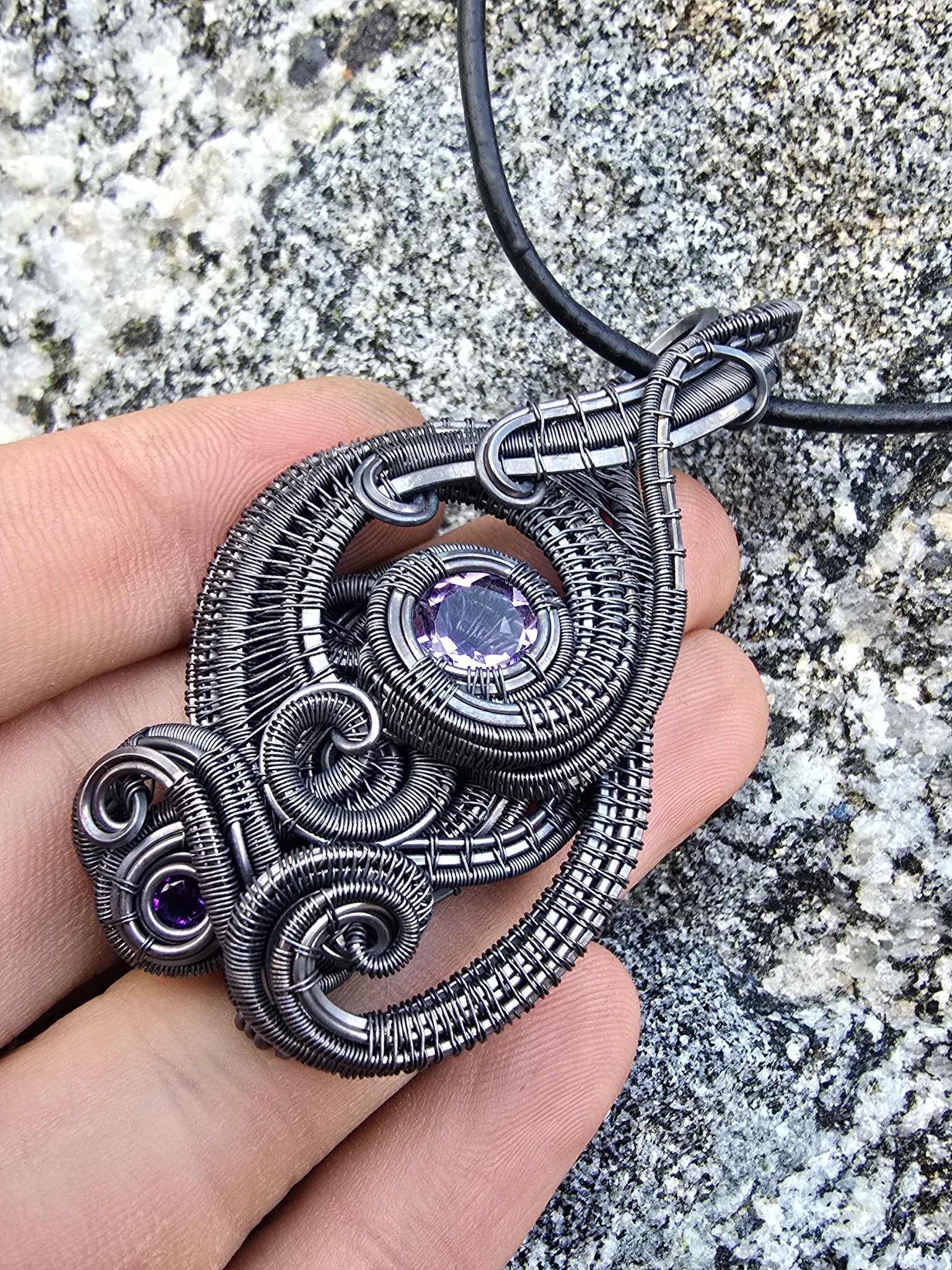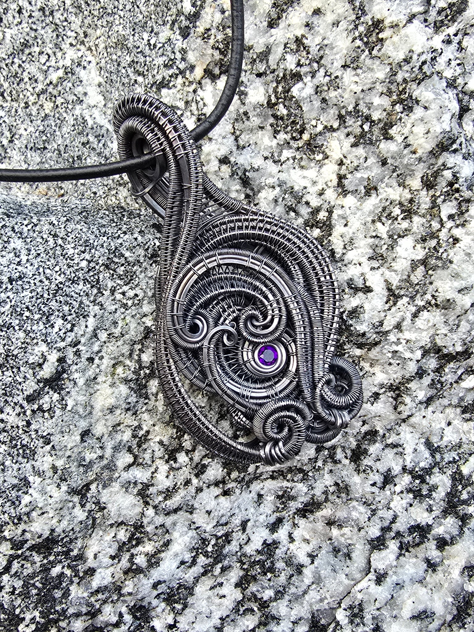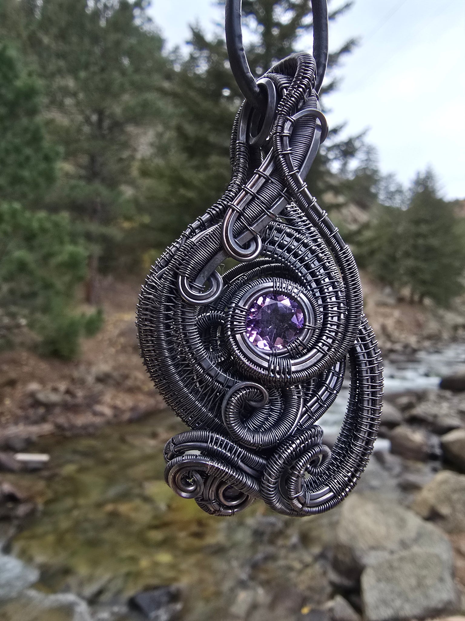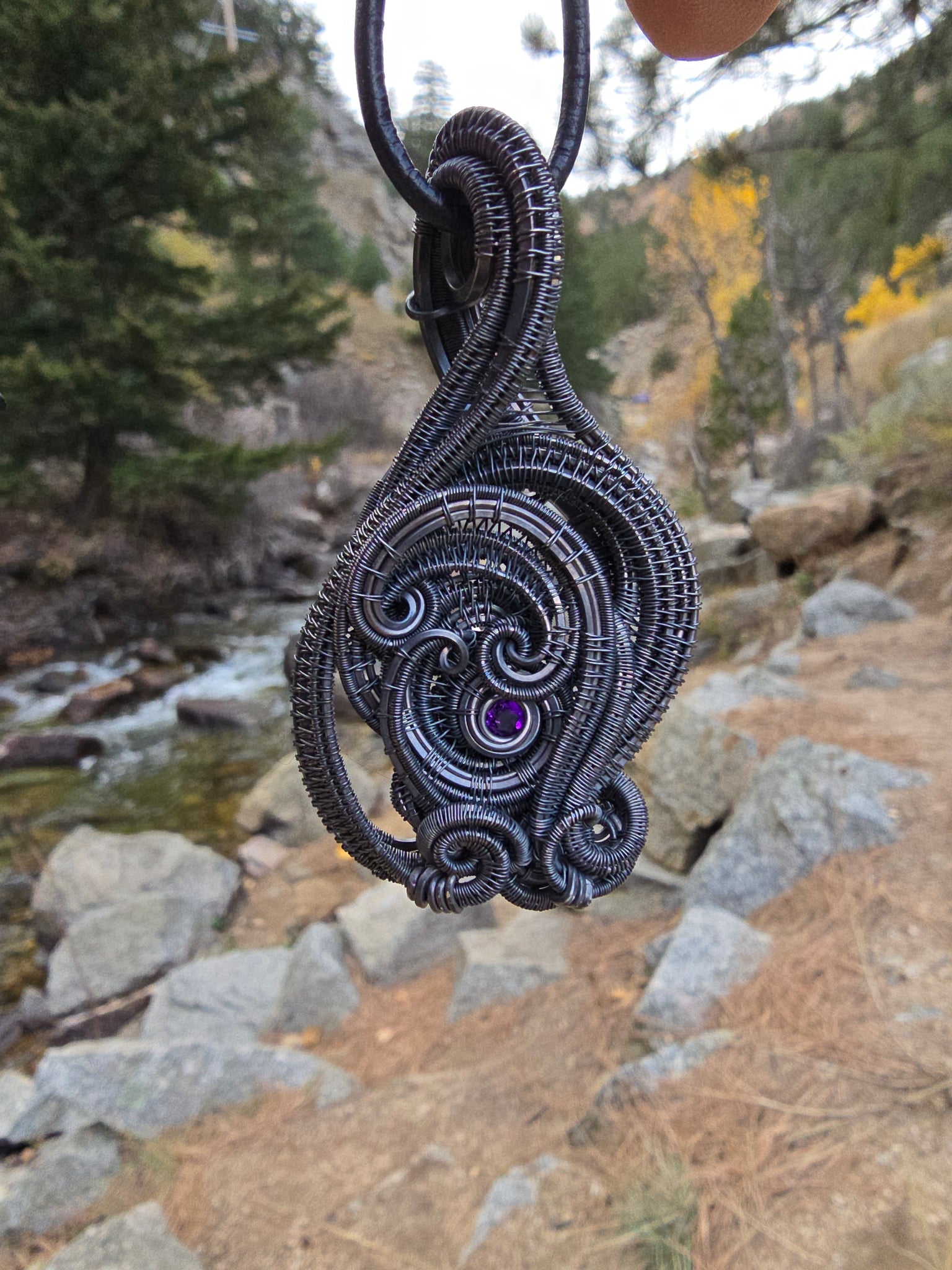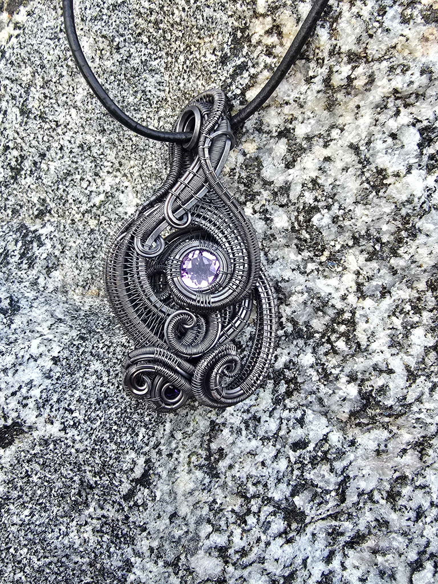 Doublesided pendant with 3 amythests wrapped in oxidized sterling silver. 2 3/4 in. 1 1/2 in.