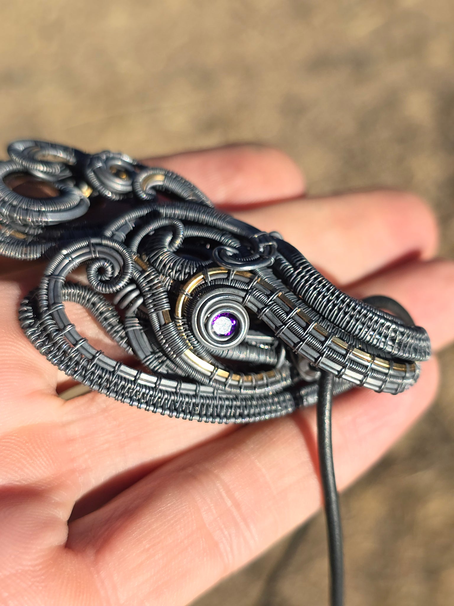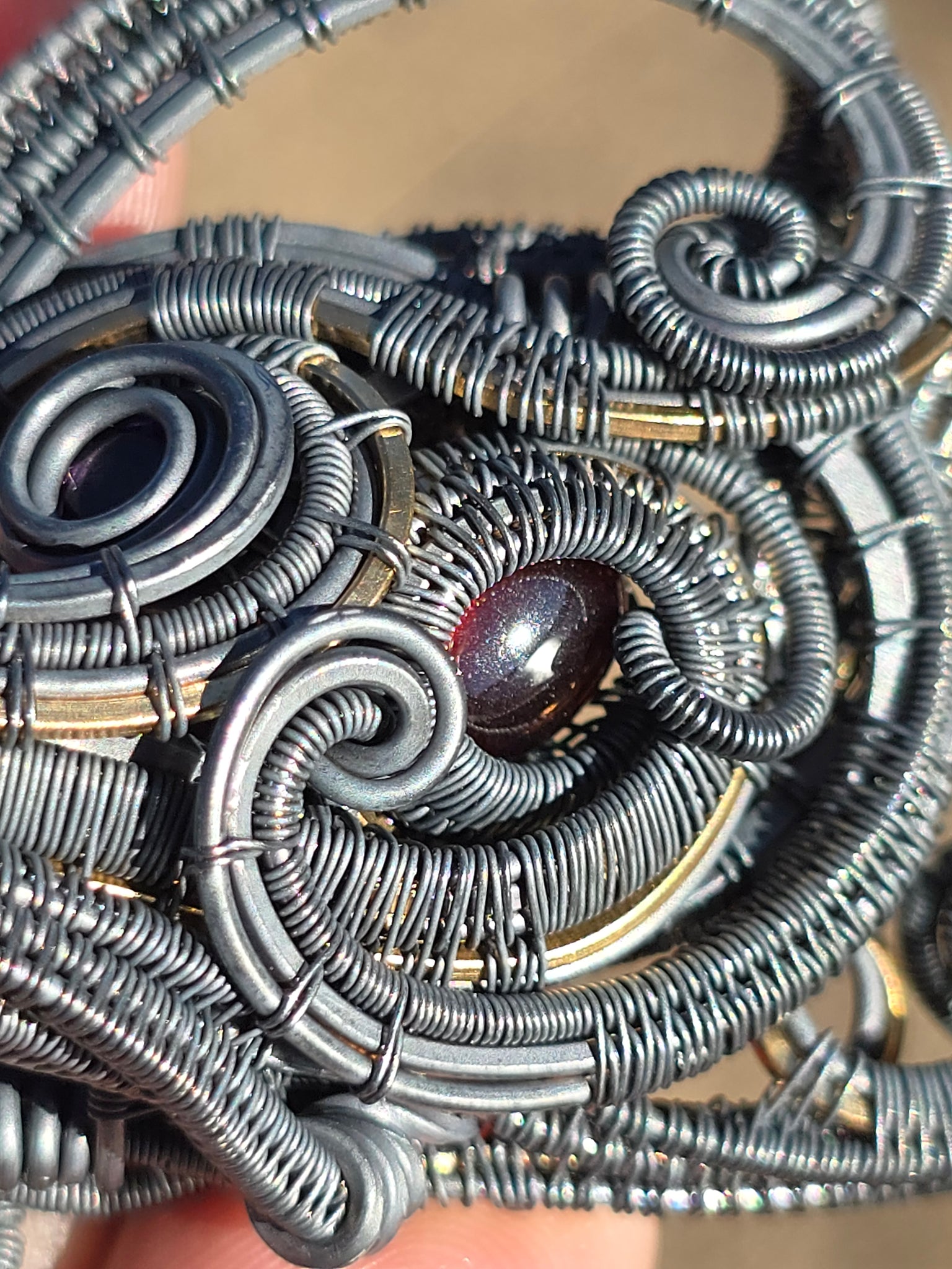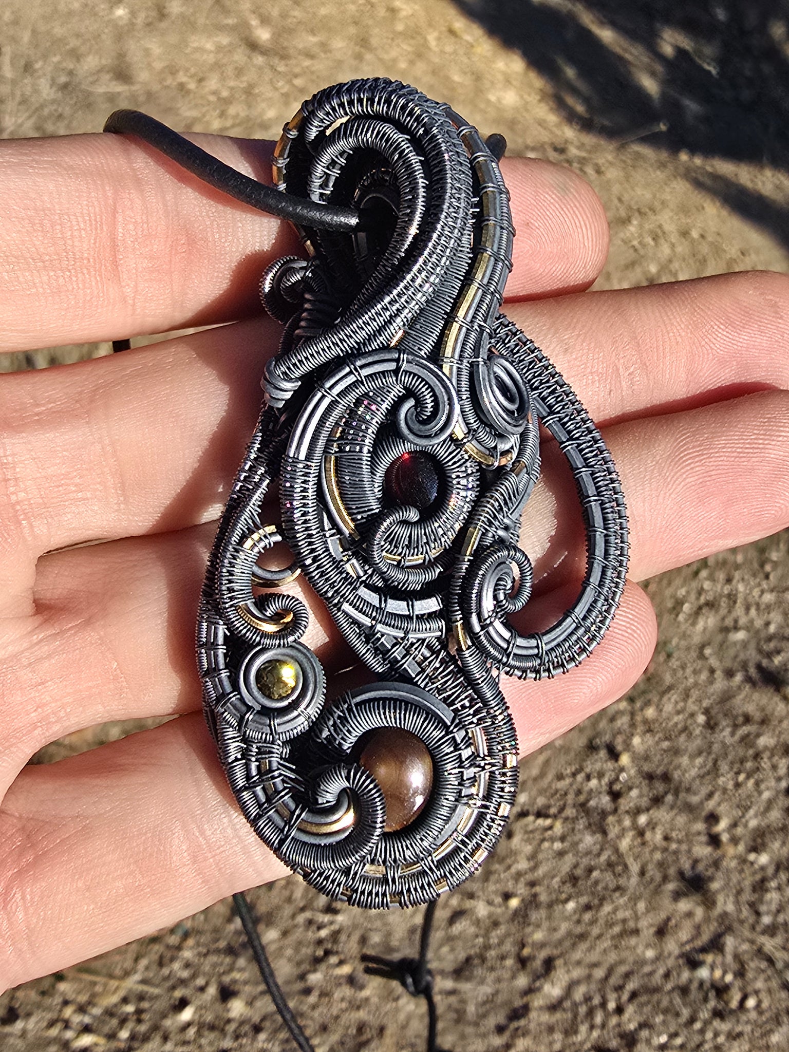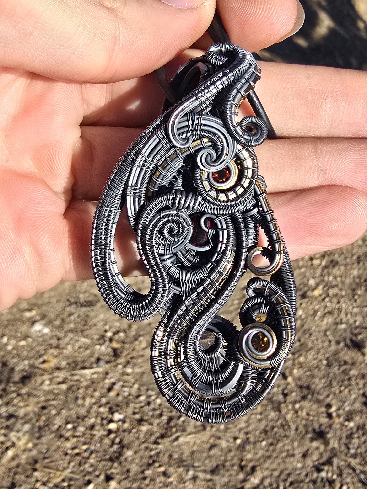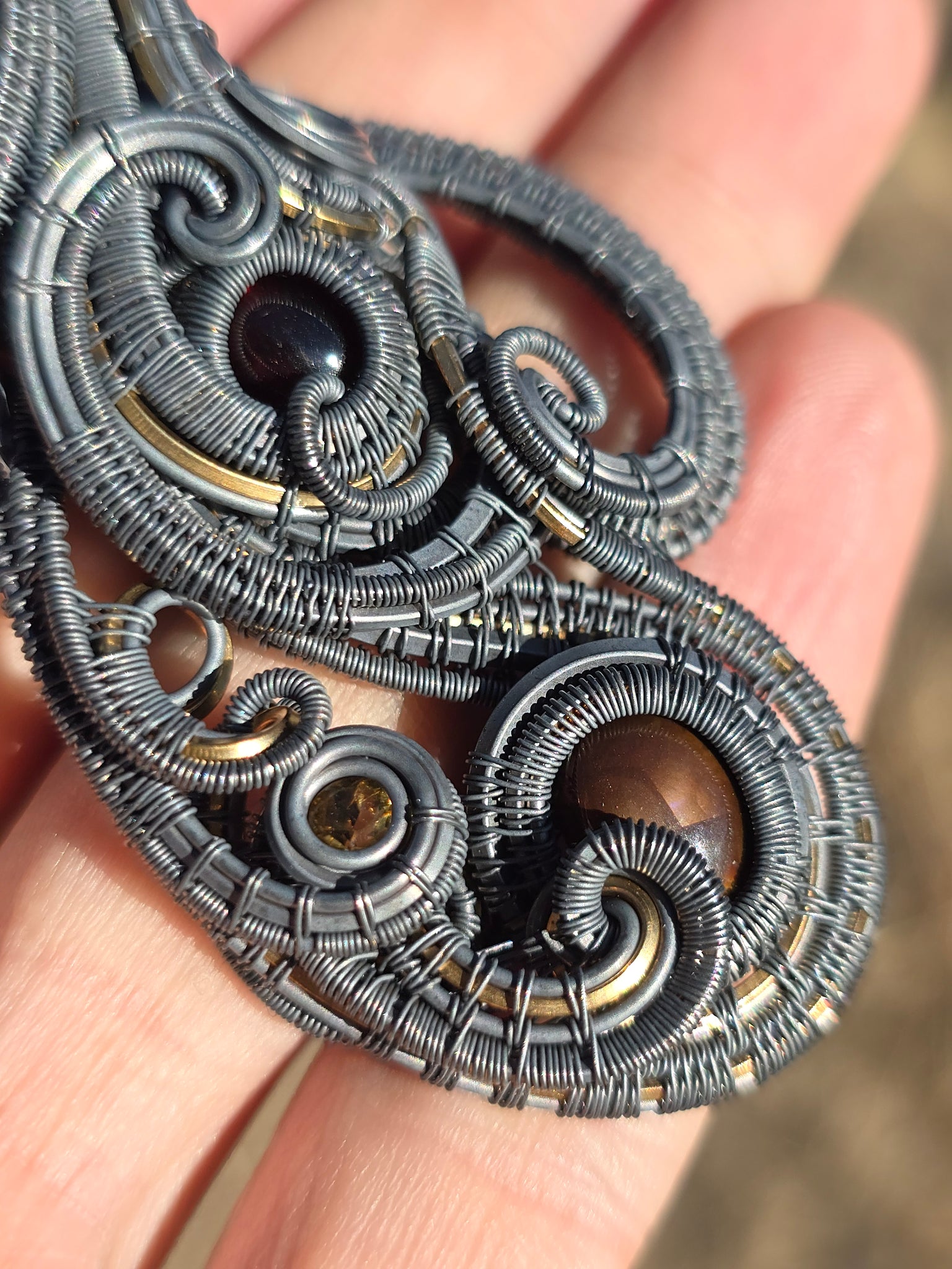 Doublesided pendant featuring fire agate, hessonite garnet, 3 hues of citrine and amythest wrapped in sterling silver and 14k gold fill.